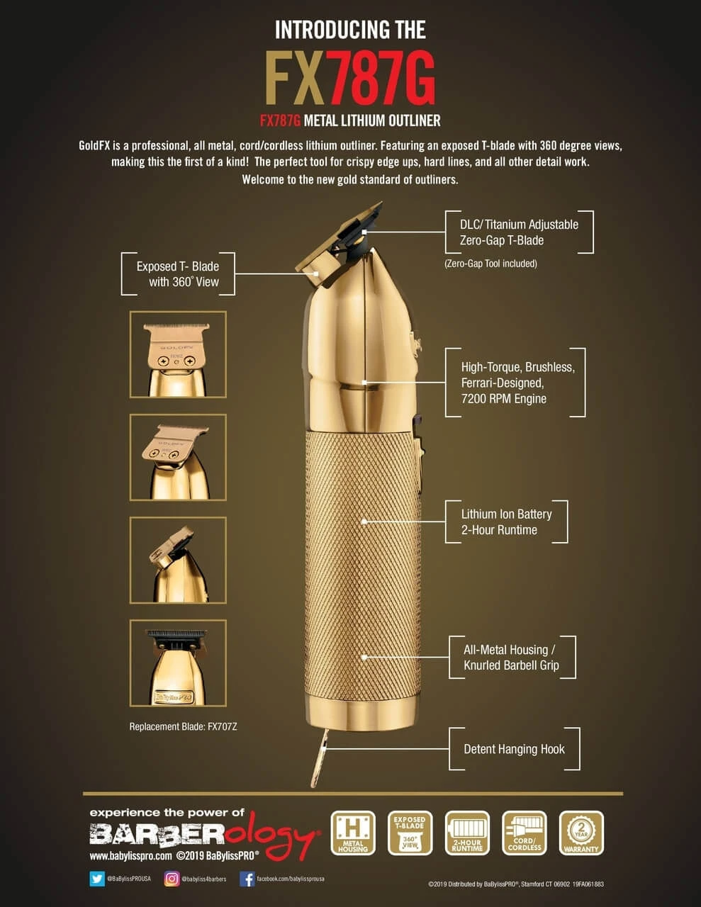 The 360ยฐ exposed, zero gap T blade is the first of its kind, allowing for unbelievable precision. The brushless motor speeds up to 7200 rpm, for the optimal combination of speed, power and precision. Lithium ion battery features 2 hour cordless runtime. Beautiful all-metal housing with glossy gold finish.