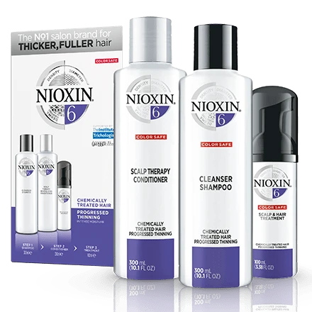 Nioxin System Kit 6 for thinning chemically-treated, bleached, permed or straightened hair delivers thicker, fuller hair with smooth control by removing follicle-clogging sebum, fatty acids and environmental residues, while restoring the moisture level and providing color protection.